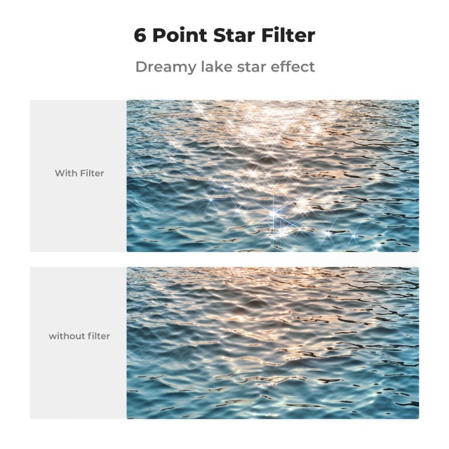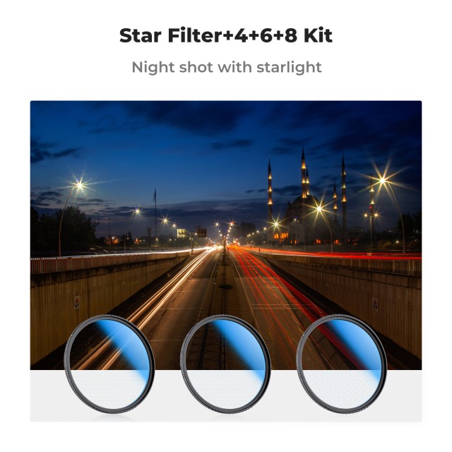 A K&F 82 mm-es csillagszűrők 3db-os készlete 4, 6 és 8 pontos keresztrácsos szűrőket tartalmaz, amelyeket arra terveztek, hogy egyedi csillagfényhatásokat adjanak a fotókhoz nagy tisztasággal és minimális tükröződéssel.