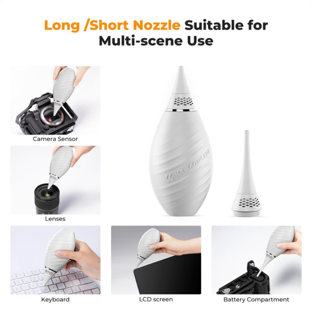 A K&F Advanced Air Blower elengedhetetlen eszköz fotósok és videósok számára, tökéletes kamerák lencséinek, érzékelőinek és egyéb érzékeny berendezések tisztításához. Ez a fúvóka hosszú és rövid fúvókával rendelkezik, amely precíz és szabályozható légáramot biztosít a por és szennyeződések eltávolításához a berendezés károsítása nélkül.