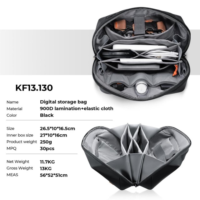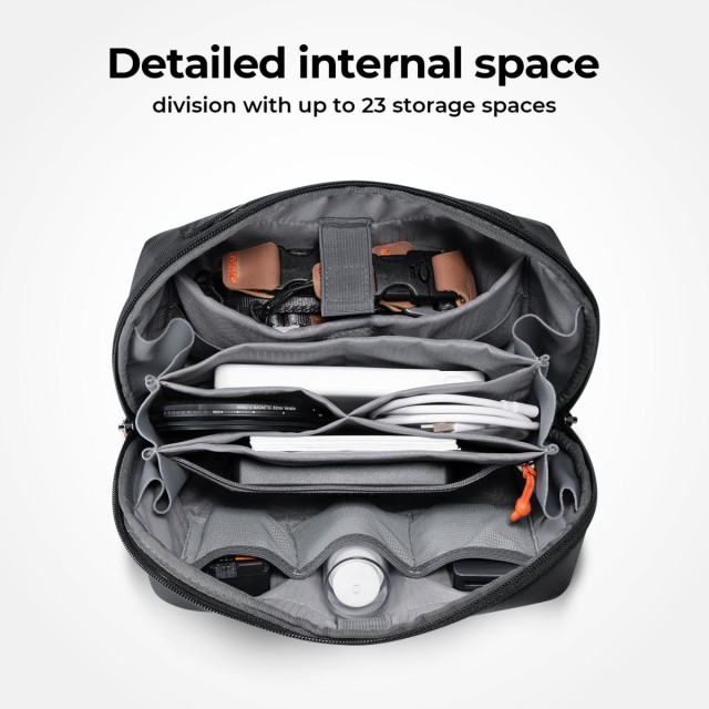 Könnyű kialakítású koncepció részletes belső térfelosztással és akár 23 tárolóhellyel. Rendezetten és rendezetten tárolja a mobiltelefonokat, töltőket, adatkábeleket, mobil áramellátást, USB pendrive-okat, egereket, autókulcsokat, bankkártyákat stb.