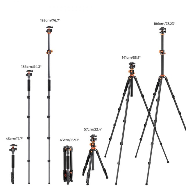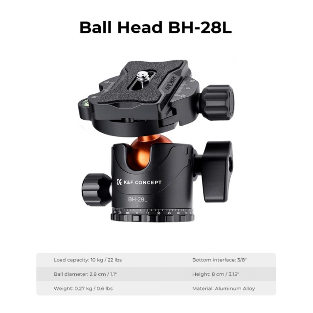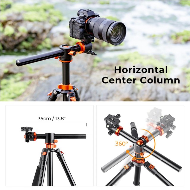 A K&F T255A3+BH-28L egy sokoldalú alumínium fényképezőgép-állvány 360°-ban forgatható keresztirányú középoszloppal, levehető monopoddal és 28 mm-es gömbfejjel, amely ideális panoráma-, makró- és utazási fotózáshoz.