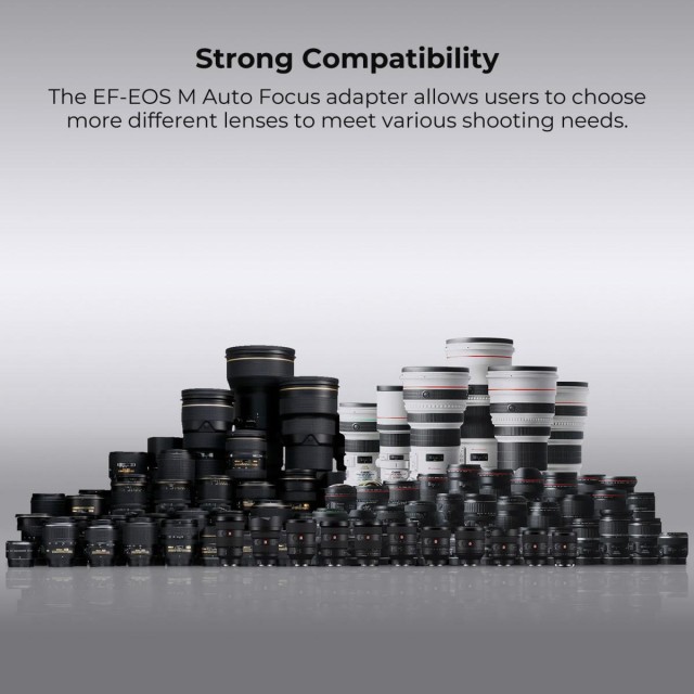 * Széles körű kompatibilitás. Alkalmas Canon EOS EF EF-S foglalatú D/SLR objektívekhez és Canon EOSM EOSM2 EOSM3 EOSM5 EOSM6 EOSM10 EOSM50 EOSM100 EOSM50II EOSM6II EOSM200 fényképezőgépekhez, és szélesebb objektívválasztékot biztosít az EOS M fényképezőgépek felhasználóinak.