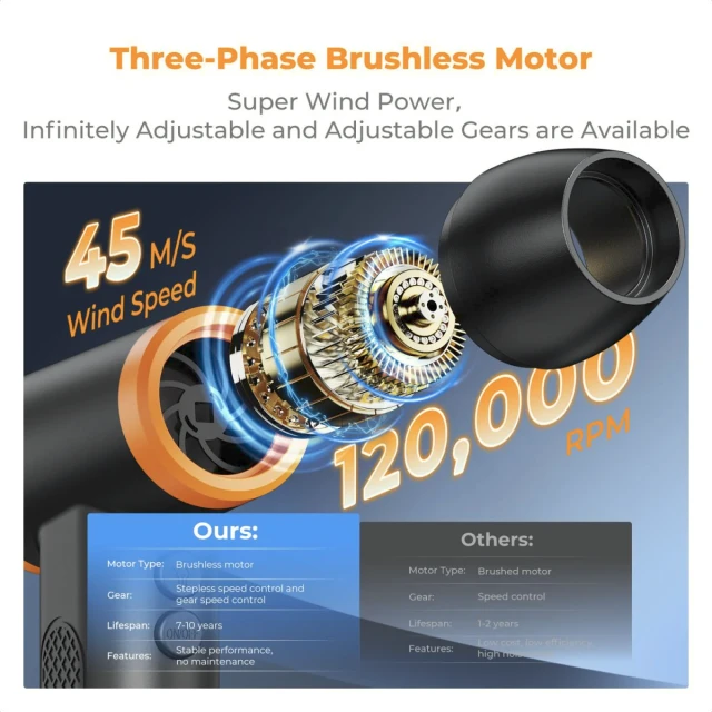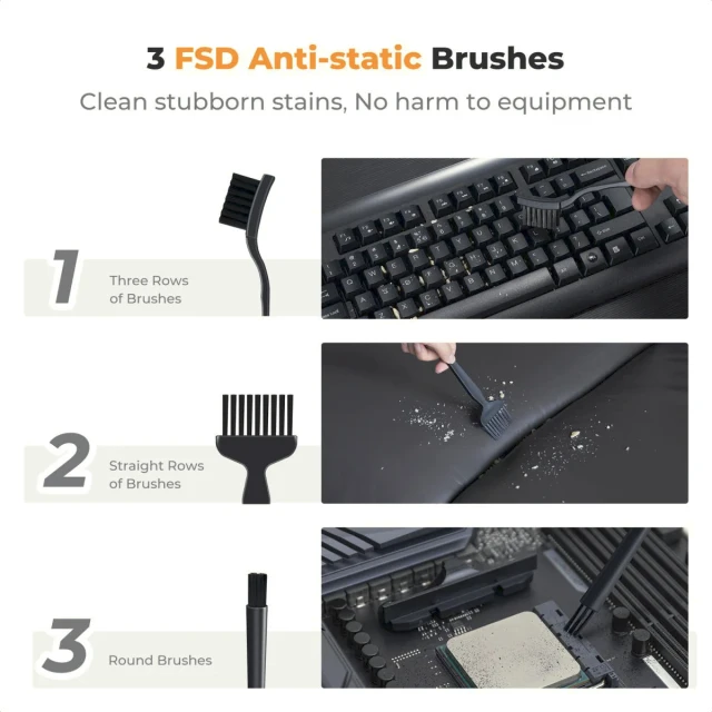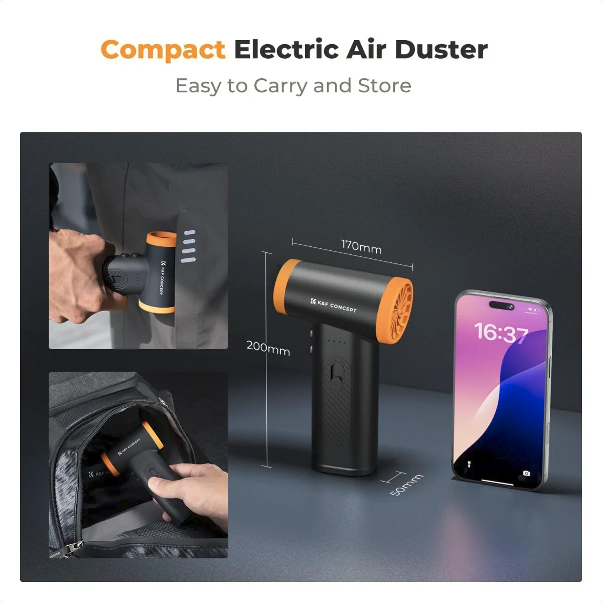 A K&F Concept 12-in-1 Brushless Compressed Air Duster egy erőteljes, környezetbarát tisztító eszköz, amelyet úgy terveztek, hogy biztonságosan és hatékonyan távolítsa el a port a fényképezőgépekről, lencsékről, érzékelőkről, elektronikai eszközökről, billentyűzetekről és más kényes berendezésekről. Tartós, kefe nélküli motorjával, többféle fúvókakkal és újrafelhasználható kialakításával hosszú távú, megbízható karbantartást biztosít, és felváltja az eldobható légpalackokat.