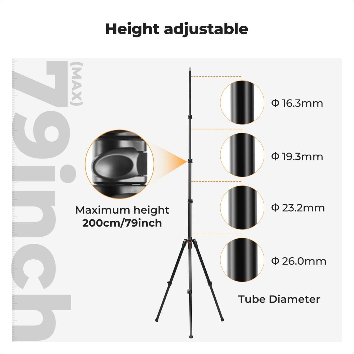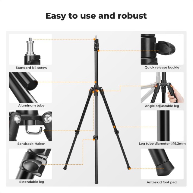 A négyrészes középső oszlopnak és a kétrészes lábaknak köszönhetően a állvány magassága 53 cm-től 2 m-ig állítható. Alacsony és magas szögből történő felvételekhez egyaránt alkalmas.