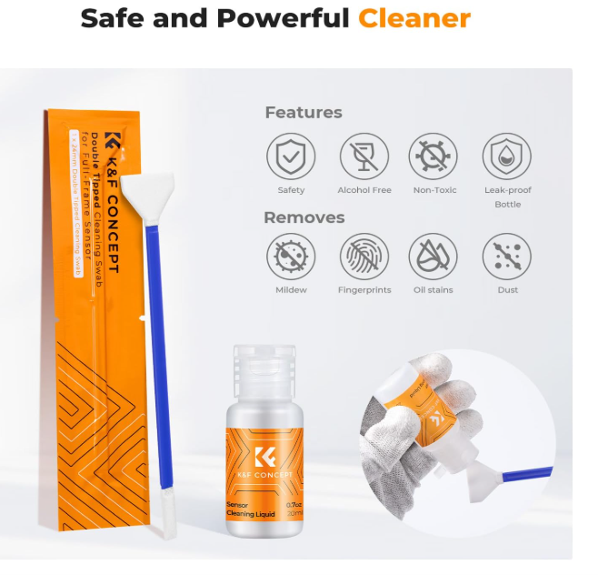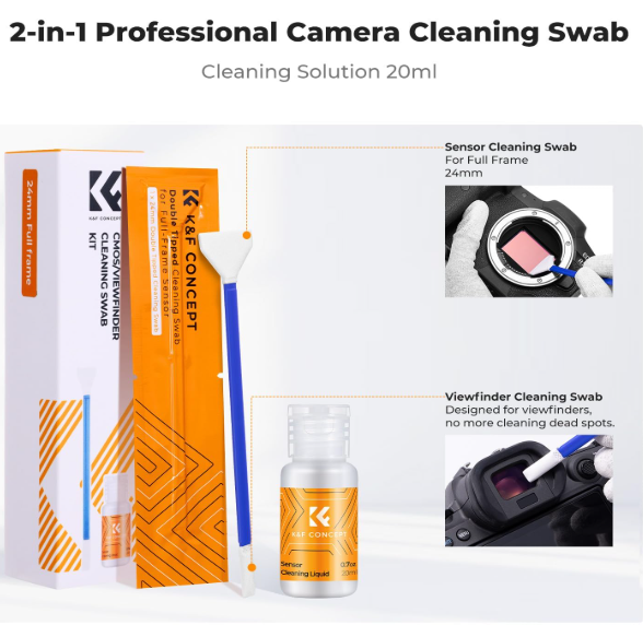 A K&F Concept Full Frame Cleaning Kit egy 2 az 1-ben megoldás 24 mm-es teljes képkocka CMOS/CCD érzékelőkhöz és keresőkhöz, amely 5 db kettős funkciójú mikroszálas törlőkendőt, 20 ml csíkmentes tisztítófolyadékot és pormentes használatra vákuumzárt csomagolást tartalmaz. Ideális tükör nélküli/DSLR fényképezőgépekhez, biztosítja a lencsék, képernyők és optikák biztonságos, precíz tisztítását karcolások és maradványok nélkül.