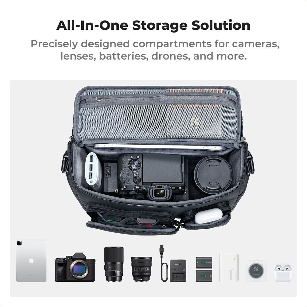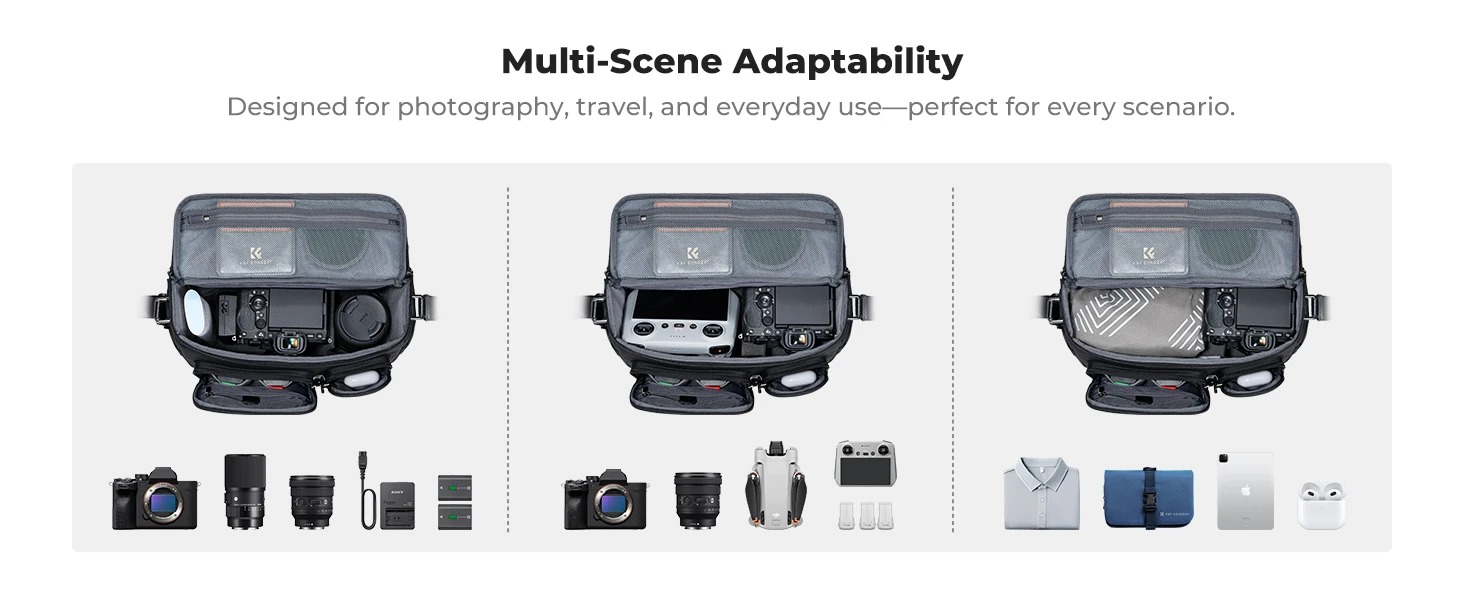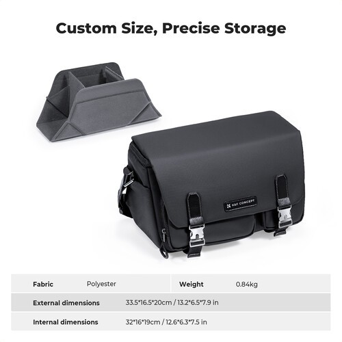 • TÖBBFUNKCIÓS: Ez a vállpántos kameratáska 1 kivehető, párnázott elválasztóval rendelkezik, amely személyre szabott tárolást tesz lehetővé. A kamera és az egyéb tárgyak elkülöníthetők és védve vannak, emellett a fő rekesz különböző méretű kamerás felszerelésekhez is testreszabható. A belső elválasztók eltávolítása után a táska könnyen átalakítható DSLR kameratáskából stílusos, mindennapi válltáskává.