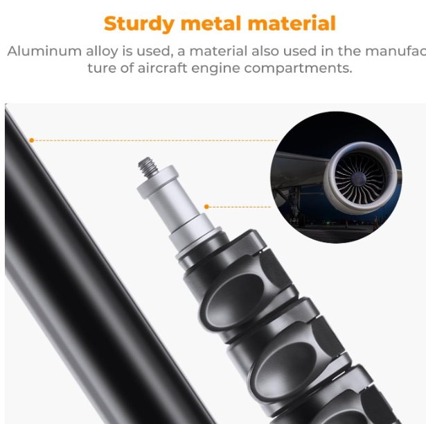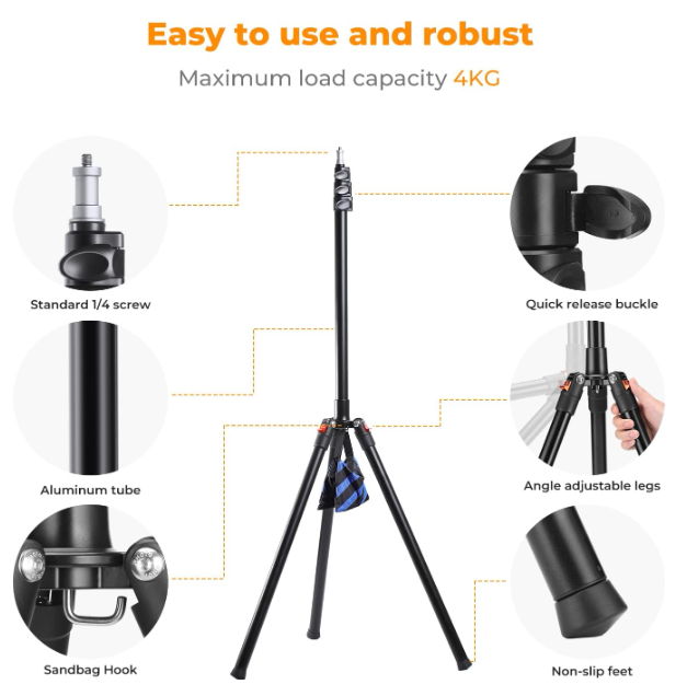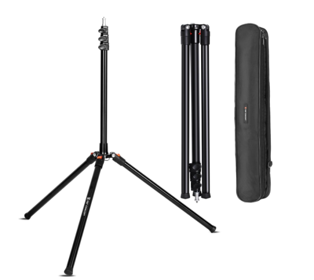 A K&F Concept 86,6 hüvelykes/2,2 m-es alumínium állvány egy kompakt, könnyű háromlábú állvány, amelyet stúdió- és helyszíni fotózáshoz terveztek, egyedülálló, összecsukható háromlábú talppal, amely mindössze 21,7 hüvelykre összecsukható, így könnyen szállítható. Tartós alumíniumötvözetből készült, gyorskioldó reteszekkel, amelyekkel a magasság 3,35 lábtól 7,21 lábig simán állítható. Akár 8,8 font súlyú felszerelést is elbír, beleértve softboxokat, vakukat, reflektorokat és esernyőket. 1/4 hüvelykes csavaros rögzítéssel és tárolótáskával rendelkezik, ami professzionális sokoldalúságot és hordozhatóságot biztosít.