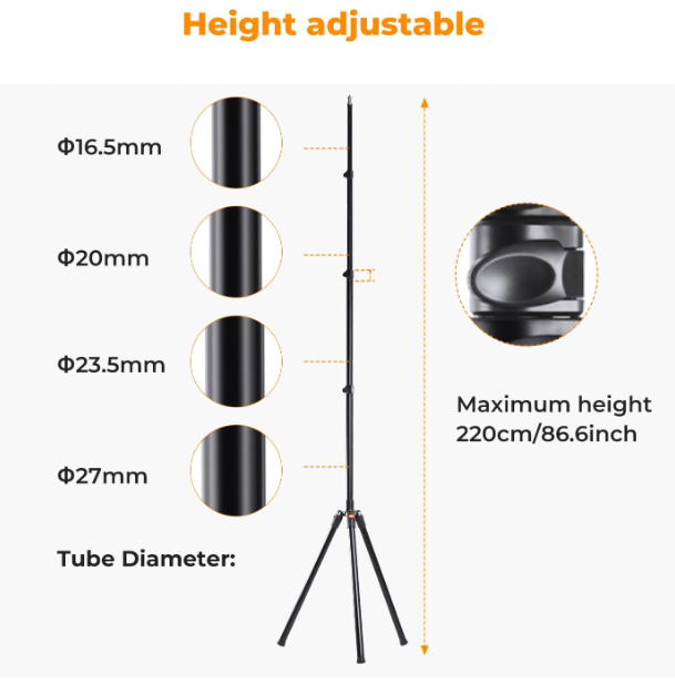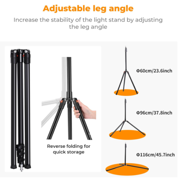 A megbízhatóságot és a kis helyigényt igénylő fotósok és videósok számára tervezett K&F Concept 86,6 hüvelykes/2,2 méteres világítóállvány robusztus alumíniumötvözetből készült, innovatív, hátrafelé összecsukható állványtalppal rendelkezik, amely kompakt, 21,7 hüvelykes (55 cm-es) csomagba összecsukható – tökéletes stúdiószervezéshez vagy mobil felvételekhez. A lenyűgöző 86,6 hüvelykes (219,5 cm) magasságig kinyújtható és minimum 40,3 hüvelykes (102,3 cm) magasságig állítható állvány kivételes rugalmasságot biztosít a felülről történő megvilágításhoz, háttértámogatáshoz vagy alacsony szögű beállításokhoz, míg könnyű, 1,95 font (1039 g) súlya könnyű hordozhatóságot garantál.
