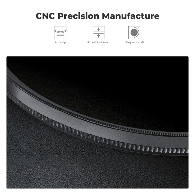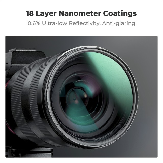 A prémium AGC optikai üvegből készült szűrő 18 rétegű, fejlett többrétegű bevonattal rendelkezik, amely minimálisra csökkenti a tükröződést, a szellemképet és a visszatükröződéseket. A tartós nano-bevonat ellenáll a párásodásnak, víznek, pornak és karcolásoknak, így megbízható teljesítményt nyújt kültéri és igényes környezetben. Az ultravékony, repülőgép-minőségű alumínium keret biztosítja a kompatibilitást a széles látószögű objektívekkel vignettálás nélkül, míg a CNC-megmunkált trapéz alakú mintázat javítja a fogást, így könnyű felszerelni és simán beállítani.