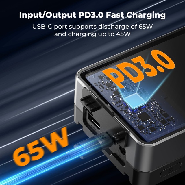- Kétirányú PD gyorstöltés, támogatja a többféle töltési protokollt, például a PD3.0/2.0-t, az USB-C interfész akár 65 W-os kisütést, akár 45 W-os töltést támogat, kevesebb mint 2 óra alatt teljesen feltölti az akkumulátort, és egyszerre tölthet mobil eszközöket, például számítógépeket/mobiltelefonokat;