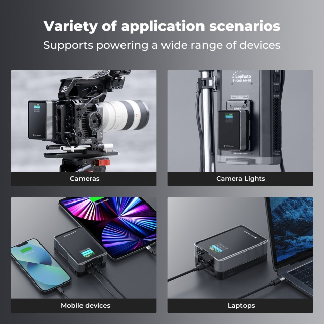 - Standard kapacitás, kis méret, de 50Wh, 3400mAh kapacitással, például iPhone 15/16 Pro Max 2-szeres töltése, iPad Pro 12,9 hüvelyk (2022) 0,8-szoros töltése, MacBook Pro 14 hüvelyk (2021) laptop 0,6-szoros töltése, 60W COB videólámpa energiaellátása körülbelül 40-50 percig.