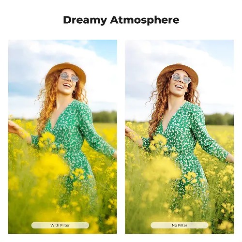 A K&F Concept 55 mm-es multifunkcionális CPL + Black Mist 1/4 szűrő ötvözi a Black Mist 1/4 diffúziós szűrő filmes lágyítását a körkörös polarizáló szűrő (CPL) tükröződéscsökkentő és színjavító előnyeivel egyetlen, ultravékony kialakításban, amely tökéletes portrék, tájképek és filmes videofelvételek készítéséhez.