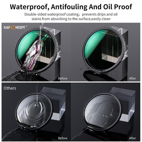 A K&F Concept 55 mm-es Nano-D sorozatú változó ND3–ND1000 szűrő prémium japán AGC üveggel, vízálló zöld nanobevonattal és ultravékony, 7,4 mm-es kerettel rendkívül sima fényvezérlést biztosít 1,5–10 fokozatban, ideális hosszú expozíciókhoz, mozgáselmosáshoz és filmes videókhoz.