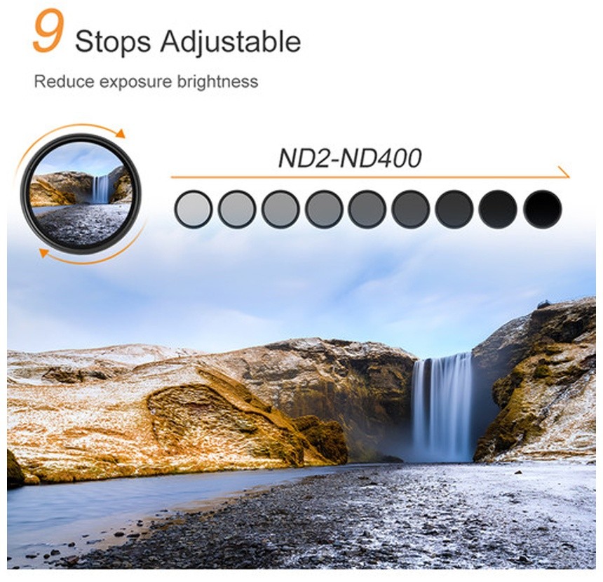 A K&F CONCEPT 58 mm-es True Color Variable ND2–ND400 szűrő egy ultravékony, kiváló minőségű semleges sűrűségű szűrő, amelynek célja, hogy a fotósok pontosan szabályozhassák az expozíciót. Prémium optikai üvegből és fényvisszaverő bevonattal készült, csökkenti a tükröződést és javítja a kép élességét, így lenyűgöző eredményeket biztosít.