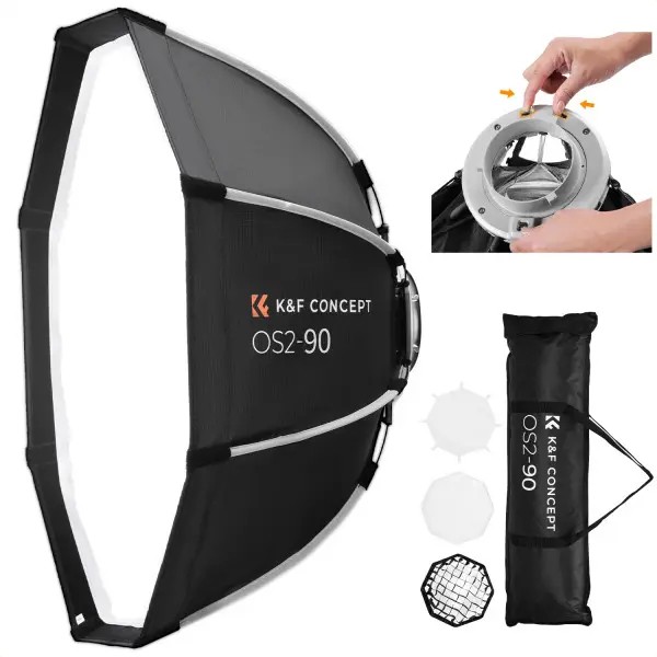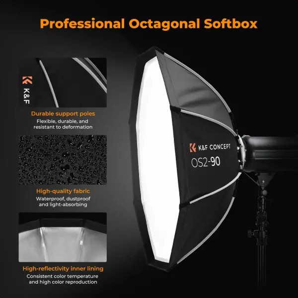 A K&F CONCEPT 65 cm-es lapos nyolcszögletű softbox egy gyorsan felállítható, Bowens-csatlakozású fénymódosító, amely sima, lágy, előnyös megvilágítást biztosít természetes fénycsillogással, tökéletes portré-, divat-, interjú- és helyszíni fotózáshoz vagy videózáshoz.