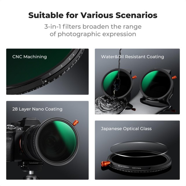 3 az 1-ben szűrő - 67mm változó ND2-32 (1-5 fokozat) és cirkuláris polarizációs szűrő CPL és fekete köd 1/4 3 az 1-ben HD objektívszűrő 28 többrétegű szűrővel fényképezőgép objektívekhez Nano-Xcel sorozat. Egy szűrő támogatja a fénycsökkentést, álomszerű hatást hoz létre, és javítja a kép színét és kontrasztját, széles körben illeszkedik a legtöbb fotózási igényhez, több alkotást biztosít a képhez.