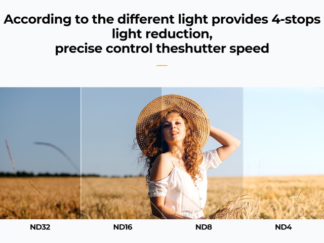 2. Az ND4-ND32 semleges sűrűségű szűrővel 4 fokozatban állítható fénycsökkentés érhető el. A semleges sűrűségű szűrő intenzitása bármikor beállítható az igényeknek megfelelően, hogy alkalmazkodjon a különböző fényviszonyokhoz.