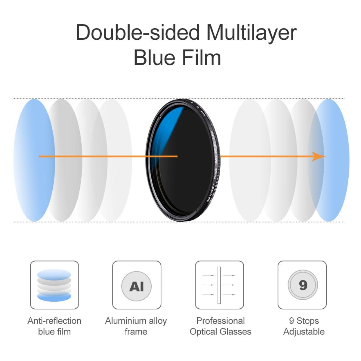 A prémium optikai üvegből készült szűrő kiváló tisztaságot biztosít és minimalizálja az optikai torzításokat. Az elülső elem elforgatásával sima átmenetek érhetők el az ND szintek között, így több rögzített ND szűrő helyett egyetlen szűrővel páratlan rugalmasságot biztosít a kültéri fényképezéshez. Az ultravékony alumínium keret segít megelőzni a vignettálást, még a nagylátószögű objektíveknél is, míg tartós szerkezete hosszú távú megbízhatóságot biztosít. Ideális tájfotózáshoz, sekély mélységélességű portrékhoz, mozgáselmosódás-effektusokhoz, fényes nappali videofelvételekhez és lassú zársebességű kreatív munkákhoz. Ez a VND szűrő elengedhetetlen eszköz az egyenletes expozíció és a művészi kontroll eléréséhez.
