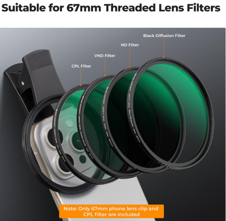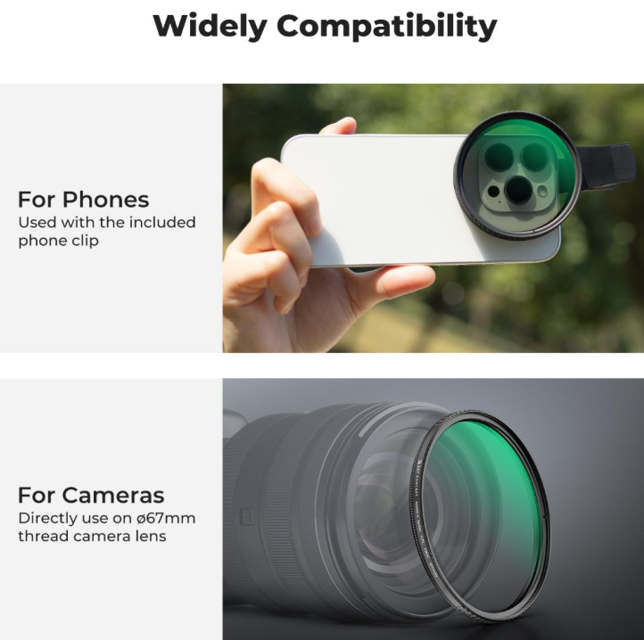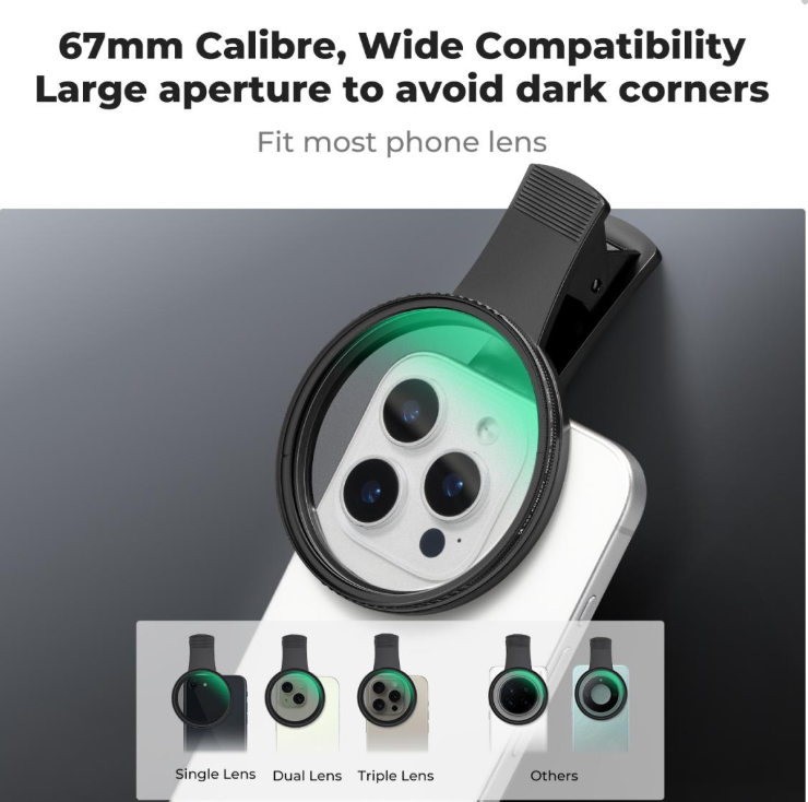 Emelje magasabb szintre mobilfotózását a K&F 67 mm-es, rácsatlakoztatható CPL telefonkamera-szűrőkészlettel, amely minden okostelefon-modellel kompatibilis univerzális kiegészítő, és amely a hétköznapi felvételeket lenyűgöző, professzionális minőségű képekké alakítja. A készlet központi eleme egy prémium 67 mm-es CPL szűrő, amely hatékonyan csökkenti a nem fémes felületek, például a víz vagy az üveg tükröződését, fokozza a természetes színek gazdagságát a tájképeken és portrékon, és finoman minimalizálja a modell bőrén látható zsíros fényt, így természetesebb, előnyösebb megjelenést biztosít – ideális szabadtéri kalandokhoz, szelfikhez vagy mindennapi fotózáshoz.