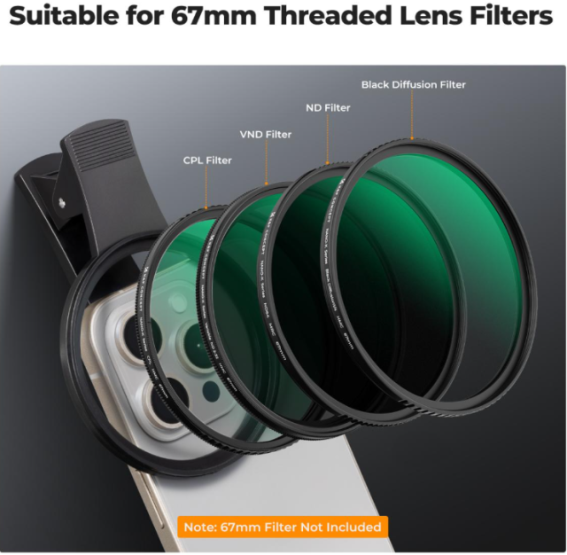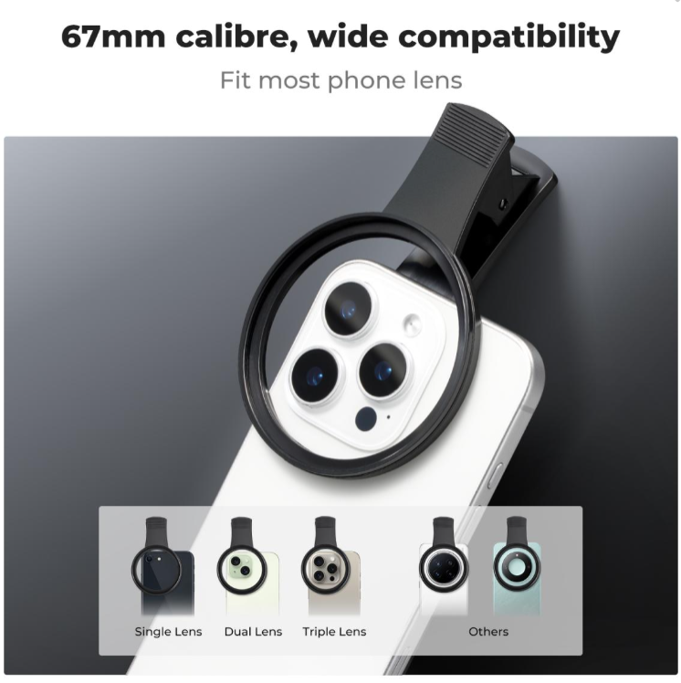 A K&F Concept 67 mm-es univerzális csavaros mobiltelefon-szűrőbilincs egy könnyű, hátul rögzíthető adapter, amely bármely okostelefont professzionális fotós eszközzé alakít, 67 mm-es csavarmenettel rendelkezik, így zökkenőmentesen kompatibilis a szabványos szűrőkkel, és széles körben támogatja az iPhone, Samsung és más modelleket. Szerszám nélküli, másodperc alatt elvégezhető felszereléssel, kompakt kialakítással a könnyű hordozhatóság érdekében, valamint robusztus szerkezettel a stabil felvételek érdekében ez a bilincs kreatív szűrőeffektusokat, például CPL-t vagy ND-t tesz lehetővé közvetlenül a mobilkamerán, ideális utazás közbeni videofelvételek, szelfik vagy tájképek készítéséhez.