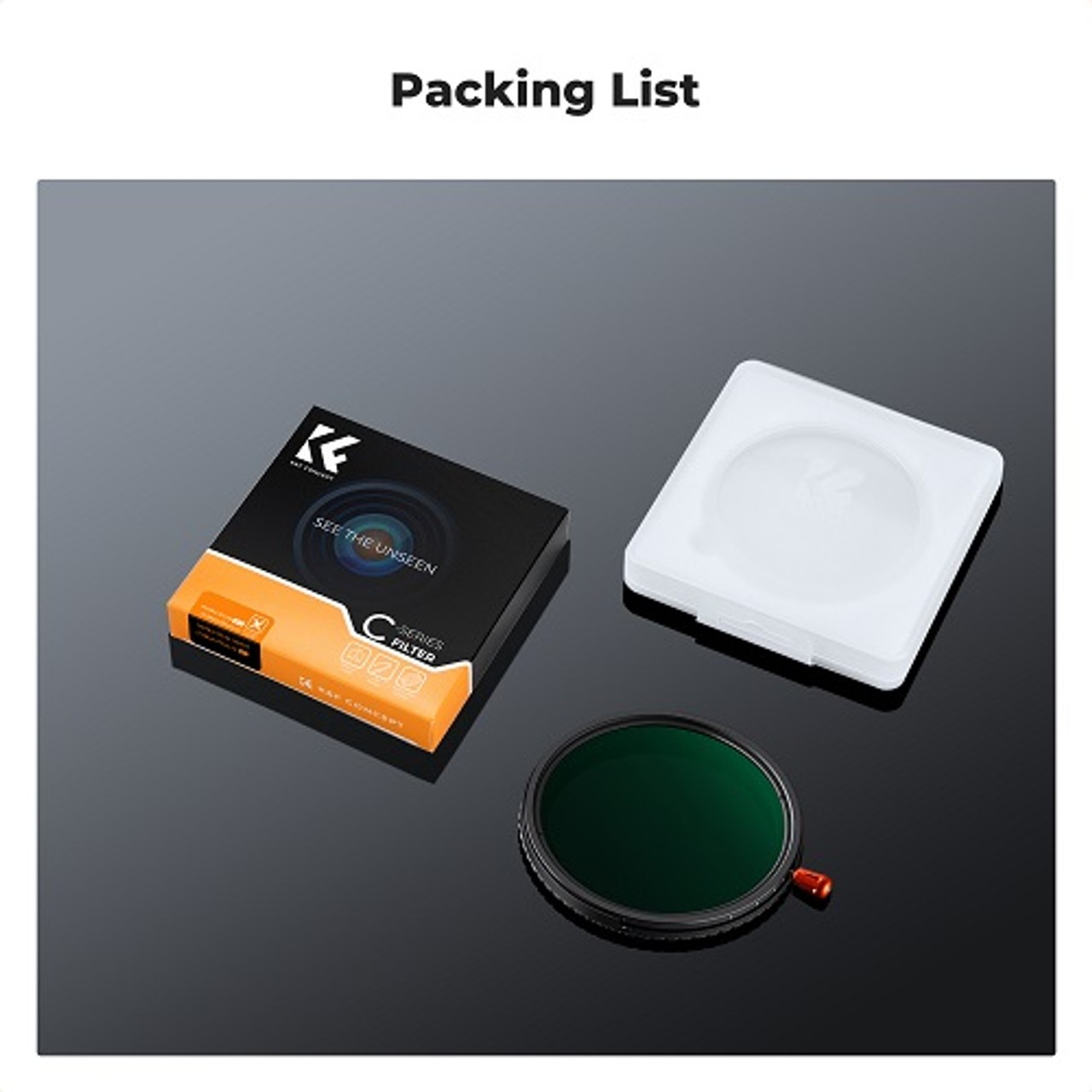 A K&F Concept 77 mm-es NANO C sorozatú 3 az 1-ben hibrid szűrő egy változó ND2–32, CPL körkörös polarizáló és Black Mist 1/4 diffúziós szűrőt egyesít egy sokoldalú eszközben. Ideális fotósok és filmesek számára, mivel sima fénycsökkentést, tükröződésmentesítést, jobb színeket és kontrasztot, valamint filmszerű lágy fényhatást biztosít – anélkül, hogy a sok változó ND szűrőnél gyakori fekete „X” effektus jelentkezne.