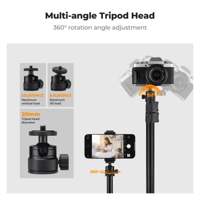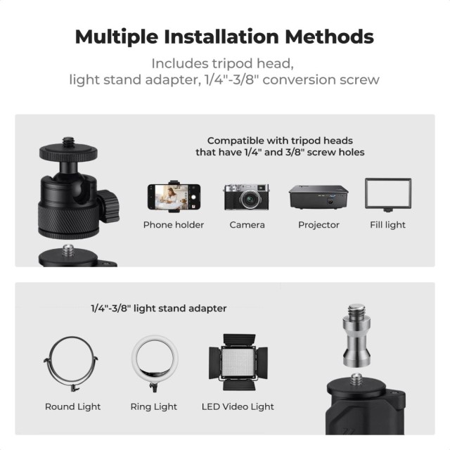 A teljesen állítható, 360°-ban forgatható gömbfej -90° és +90° közötti dőlésszöggel teljes szabadságot biztosít a felszerelés portré vagy tájkép irányba történő elhelyezéséhez. A 1/4″-es csavaros rögzítéssel, a mellékelt 1/4″-es gömbfej lemezzel és a 1/4″-3/8″-as adapterrel ez az állvány számos eszközhöz használható, beleértve a LED-es lámpákat, telefoncsipeszeket, webkamerákat, tükör nélküli fényképezőgépeket és gyűrűs lámpákat, így sokoldalú és elengedhetetlen eszköz a tartalomkészítők, élő közvetítők, fotósok és videósok számára.