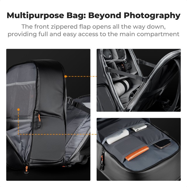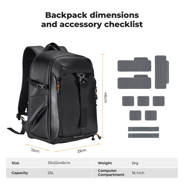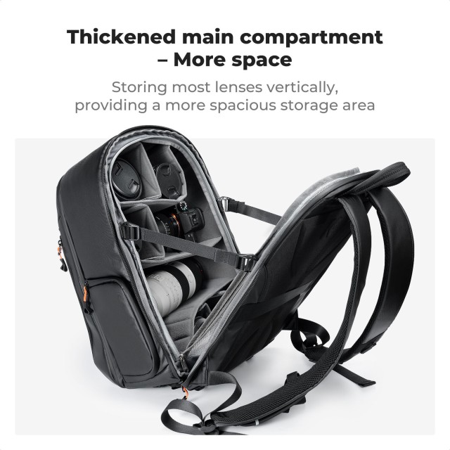 A K&F Concept KF13.211 25 L hátizsák intelligens egyensúlyt biztosít a kapacitás és a hordozhatóság között, ideális megoldás a sokat utazó fotósok számára. Hátsó kagylószerű kialakítása teljes hozzáférést biztosít, így tökéletesen alkalmas a felszerelés rendezésére, míg az oldalsó panel lehetővé teszi a kamera gyors elővételét anélkül, hogy le kellene venni a hátizsákot. A testreszabható habszivacs elválasztók védik a DSLR vagy tükör nélküli fényképezőgépeket, a pótlencséket és a kiegészítőket, míg a párnázott tok biztonságban tartja a laptopot vagy a táblagépet.