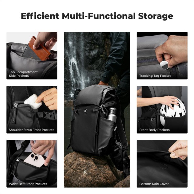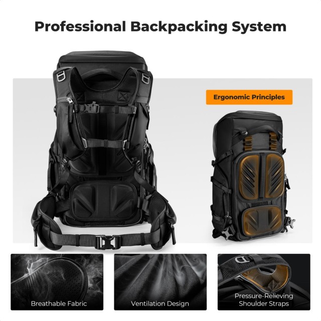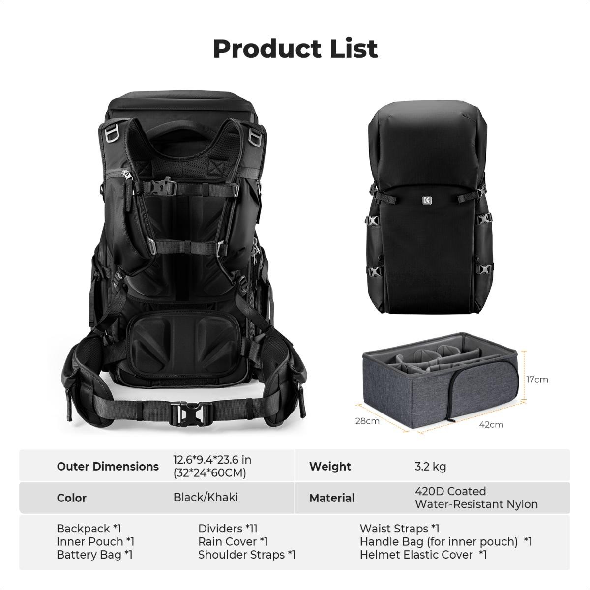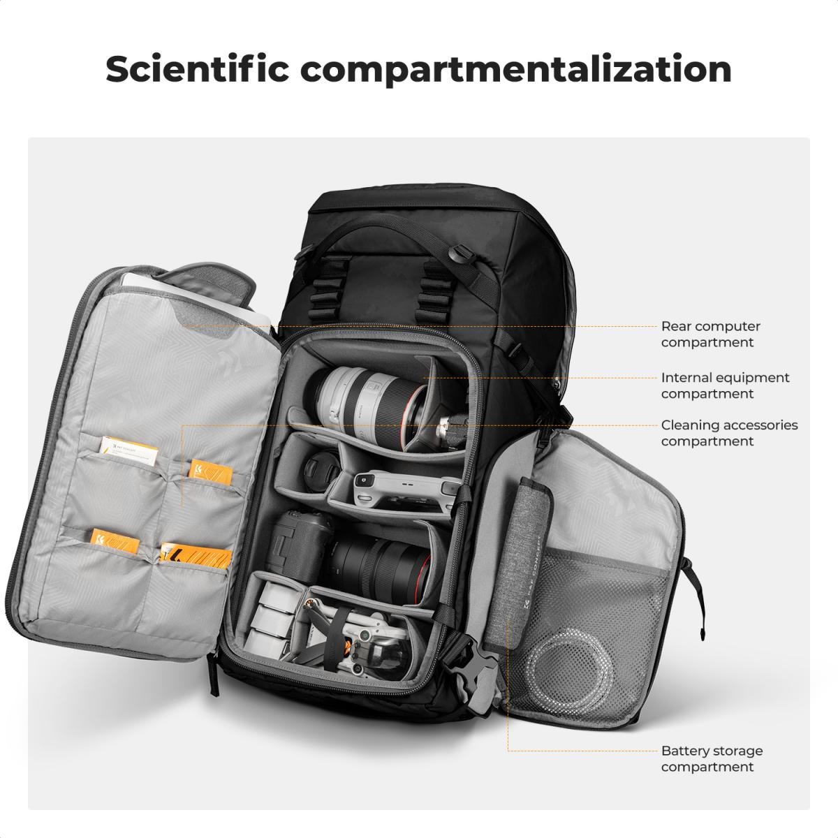 A K&F CONCEPT Star Wander05 40L fényképezőgép-hátizsák (fekete) sokoldalú, nagy kapacitású tárolóhelyet kínál fotósoknak és utazóknak. 2 fényképezőgép, 6 objektív és kiegészítők tárolására tervezték, testreszabható rekeszekkel, gyors oldalsó hozzáféréssel, ergonómikus pántokkal és tartós, fröccsenésálló 420D nylon anyaggal rendelkezik, amely megbízható védelmet nyújt minden kaland során.