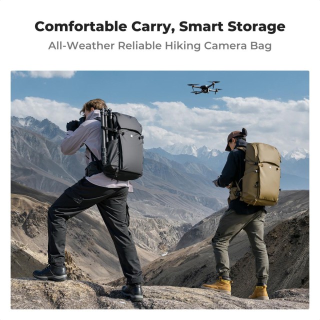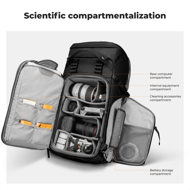 A K&F CONCEPT Star Wander05 40L fényképezőgép-hátizsák azoknak a fotósoknak készült, akiknek mind a kapacitás, mind a kényelem fontos. 40 literes tárolóterével 2 DSLR/SLR fényképezőgép, legfeljebb 6 objektív, drónok és számos kiegészítő elfér benne, és kompatibilis a Sony, Canon, Nikon és DJI berendezésekkel. Moduláris kialakításának köszönhetően 8 állítható elválasztóval, felső rekesszel a ruhák számára, cipzáras belső zsebbel a telefonok és akkumulátorok számára, alsó főrekesszel a fényképezőgépek és drónok számára, valamint további tárolóhellyel a derékzsákban, rugalmas elülső rekeszben, oldalsó zsebekben és laptoprekeszben rendelkezik. A professzionális hordozó rendszer állítható pántokkal, kivehető deréktámasztékkal, lélegző EVA háttámlával és cipzáras felső zsebbel rendelkezik a gyorsan elérhető tárgyak számára, így minden testalkatú személy számára kényelmes. Kopás- és fröccsenésálló, PU bevonatú 420D nylonból készült, ez a hátizsák ideális kültéri, utazási és kalandfotózáshoz. A gyors oldalsó hozzáférés lehetővé teszi a fotósok számára, hogy azonnal megörökítsék a pillanatokat, míg a robusztus kialakítás minden környezetben biztonságban tartja a felszerelést.