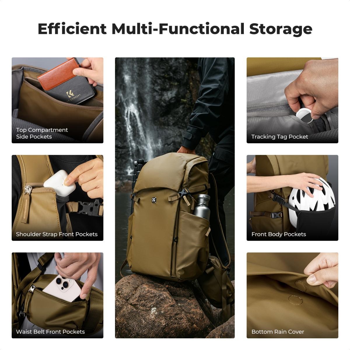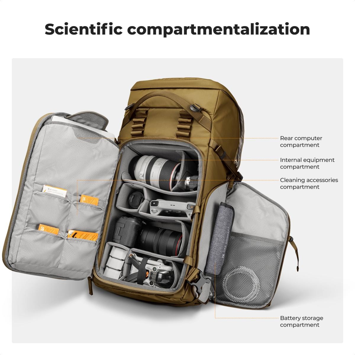 A K&F CONCEPT Backpack 40L Star Wander05 (Champagne) egy professzionális minőségű, kültéri fotózáshoz és túrázáshoz tervezett hátizsák, amely kényelmet, védelmet és gyors hozzáférést biztosít. Ergonomikus, háromszoros állítható hevederrendszerrel, időjárásálló anyagokkal és moduláris, kivehető kamera-betéttel ellátott hátizsák ideális fotósok és kalandorok számára, akik nehéz felszerelést szállítanak nagy távolságokra.