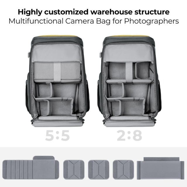 Bemutatjuk az innovatív Magic Bin fotós hátizsákot, amely testreszabható 5:5 és 2:8 arányú térkialakítással rendelkezik a különböző fotózási igényekhez, beleértve a kültéri, utcai és portréfotózást. A stabilitást rejtett belső tartószálas megerősítő rudakkal biztosítja, az elülső szélességbővítés pedig 2-3 literes kapacitásnövekedést tesz lehetővé. A felső és oldalsó hozzáférés, valamint a felfüggesztett 16 hüvelykes számítógéprekesz kényelmet és biztonságot nyújt, megakadályozva a számítógép közvetlen ütközését. Ideális a felszerelésük sokoldalúságát és védelmét kereső fotósok számára.