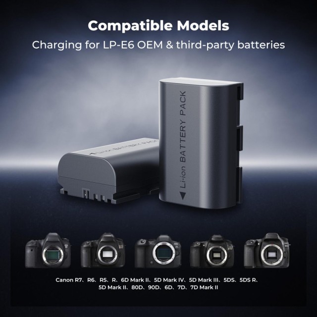 - * 【Kompatibilis a Canonnal】 EOS R5, R6, R7, EOS RF, EOS 5D Mark IV, 5D Mark III, 5DS, 5DS R, 5D Mark II, 6D, 6D Mark II, 7D, 7D Mark II, 90D, 80D, 70D, 60D, 60Da, XC10, XC15, BG-E6, BG-E7, BG-E9, BG-E11, BG-E13, BG-E14 fényképezőgépekkel.
