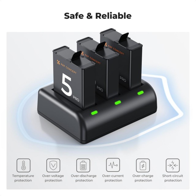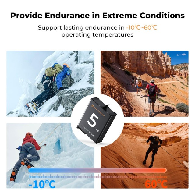 K&F Concept Osmo 360 Osmo Action 5 Pro/4/3 akkumulátortöltő, 3 db 2100 mAh Action 5 Pro akkumulátor és 3 rekeszes gyorstöltő, kompatibilis a DJI OSMO 360, DJI OSMO Action 5 Pro, Osmo Action 4 és Osmo Action 3 készülékekkel. A K&F Concept 3 darabos Osmo Action 5 Pro akkumulátor töltő készlet kompatibilis a DJI OSMO 360, DJI Osmo Action 5 Pro, Action 4 és Action 3 készülékekkel, biztosítva a zökkenőmentes integrációt és a hibátlan teljesítményt a kamerával. Három nagy kapacitású 2100 mAh Action 5 Pro/4/3 akkumulátor (3,87 V) tartozik hozzá, amelyek hosszabb üzemidőt biztosítanak, -10 °C és 60 °C közötti hőmérsékleten működnek, így ideálisak síeléshez, sivatagi túrákhoz és víz alatti felvételekhez.