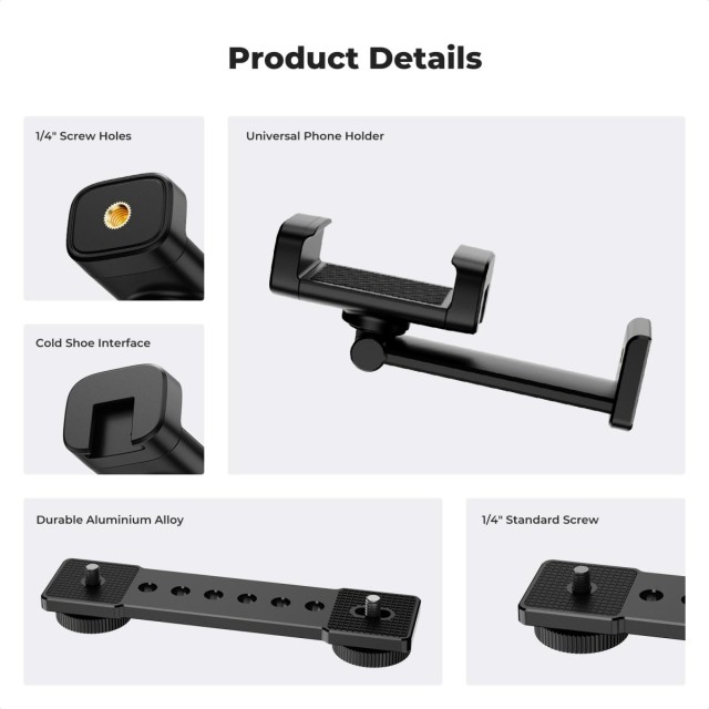 A K&F Concept DJI Osmo Pocket 3 mobiltelefon-tartó a Pocket 3 tökéletes kiegészítője, amely zökkenőmentesen integrálja okostelefonját a nagyobb képernyőnézet és a továbbfejlesztett kamera vezérlés érdekében. Prémium alumíniumötvözetből és tartós PC+ABS műanyagból, rozsdamentes acélból készült, stabil és biztonságos csatlakozást biztosít. Sokoldalú 360°-os vízszintes és függőleges forgathatósággal, 180°-os dőlésszög-beállítással és többféle rögzítési lehetőséggel, beleértve a hideg cipőket és a 1/4 hüvelykes portokat, ideális állványokhoz, lámpákhoz, mikrofonokhoz és egyebekhez.