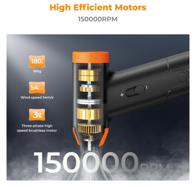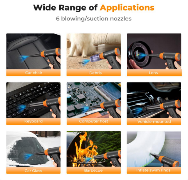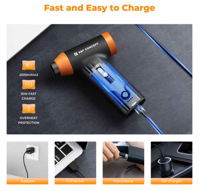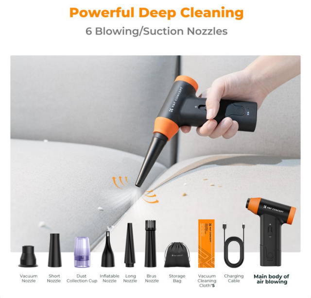 A K&F Concept elektromos tisztítólevegő-fúvókészlet a hagyományos sűrített levegős kannák innovatív alternatívája, amely erőteljes és újrafelhasználható teljesítményt kínál a különböző tisztítási igényekhez. Ez a kefe nélküli motorral tervezett légporszívó 54 m/s maximális szélsebességet és akár 180 G szélerőt is képes generálni, így a por 99%-át egyetlen perc alatt eltávolíthatja.
