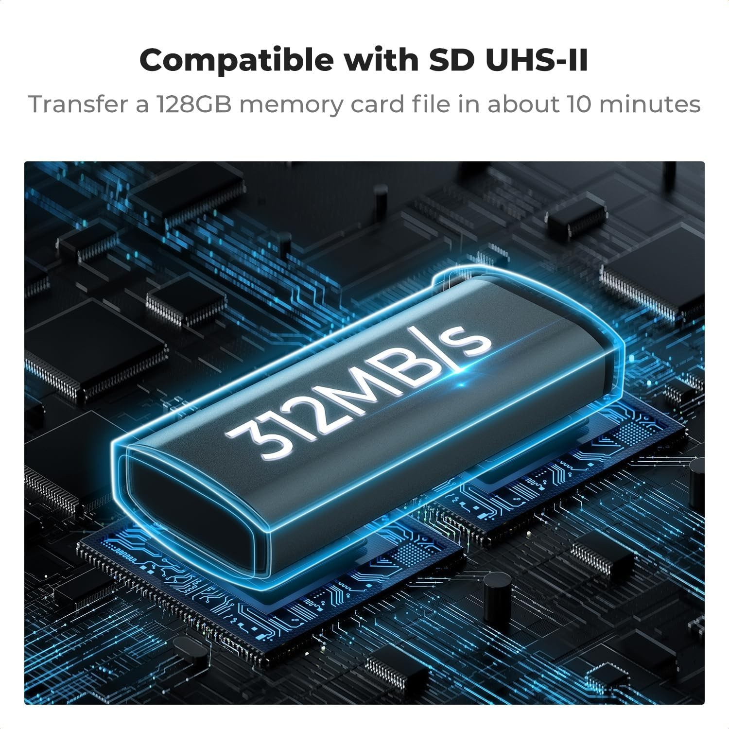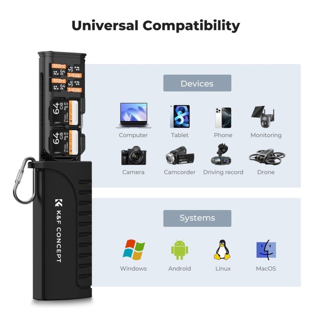 A K&F CONCEPT nagysebességű flashkártya-tároló egy kompakt, védő tárolóeszköz, amely SD-kártyák, micro SD (TF) kártyák és Nano SIM-kártyák biztonságos tárolására szolgál. Tartós kivitelének és univerzális kompatibilitásának köszönhetően a fontos memóriakártyákat rendezett állapotban és könnyen hozzáférhető helyen tárolja, miközben kényelmes USB-C és USB-A csatlakozási lehetőségeket kínál.