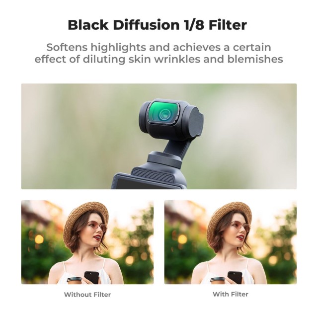 - 【Osmo Pocket 3 fekete diffúziós 1/8 szűrő】Ez a fekete diffúziós 1/8 szűrő segít finoman csökkenteni a fénypontokat és csökkenteni a tükröződést, csökkenti a kontrasztot, lágyabb és álomszerűbb filmes hatást érve el.