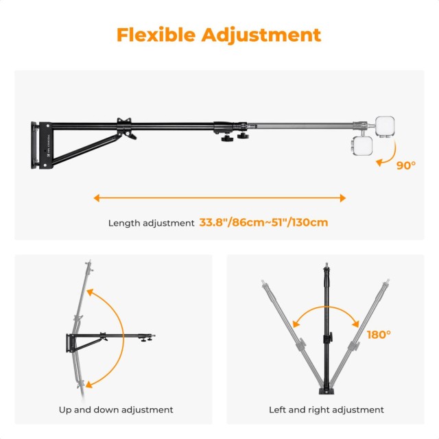 A háromszög alakú konstrukció növeli a kar stabilitását, és lehetővé teszi, hogy akár 130 cm-re is kinyújtható legyen, így különböző igényeknek is megfelel. Biztonságosan rögzíthető szilárd falakra vagy mennyezetekre, így megbízható megoldást kínál a berendezések beállításához.