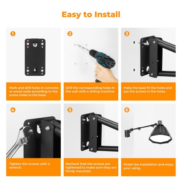 A fekete színű kar rozsdásodásnak ellenálló, erős fémből készült, ami hosszú élettartamot és szilárdságot biztosít. A csomagban négy távtartó csavar található a betonfalakhoz való biztonságos rögzítéshez, ami stabil és biztonságos beállítást biztosít.
