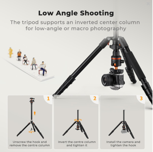 A K&F T255A3+BH-28L egy sokoldalú alumínium fényképezőgép-állvány 360°-ban forgatható