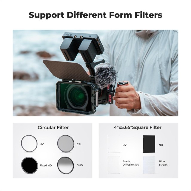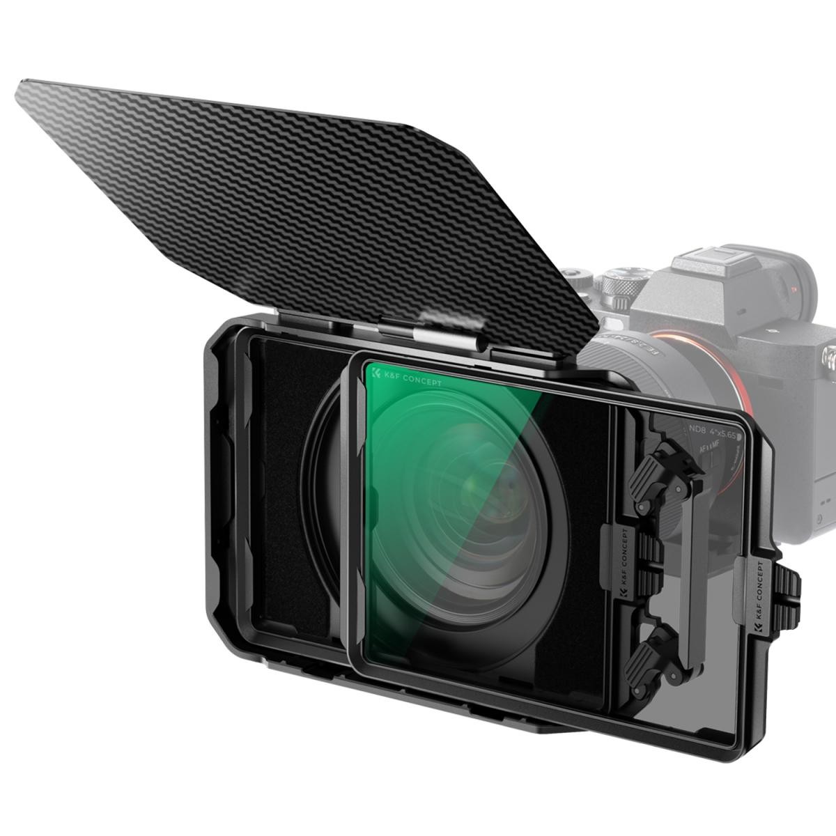 Könnyű, matt szénszálas matte box, 34 mm-es kúpos kialakítással, amely megakadályozza a vignettálást és a szórt fényt, így 16 mm-es és annál nagyobb objektívekkel is éles, kontrasztos felvételek készíthetők. Két 4x5,65 hüvelykes szűrő befogadására alkalmas, biztonságos reteszeléssel, 5 adaptergyűrűvel (67-95 mm), bővítőportokkal, tárolótáskával és 28 rétegű nano-bevonatú ND8 szűrővel, amely 4K/8K felbontású felvételekhez is alkalmas.
