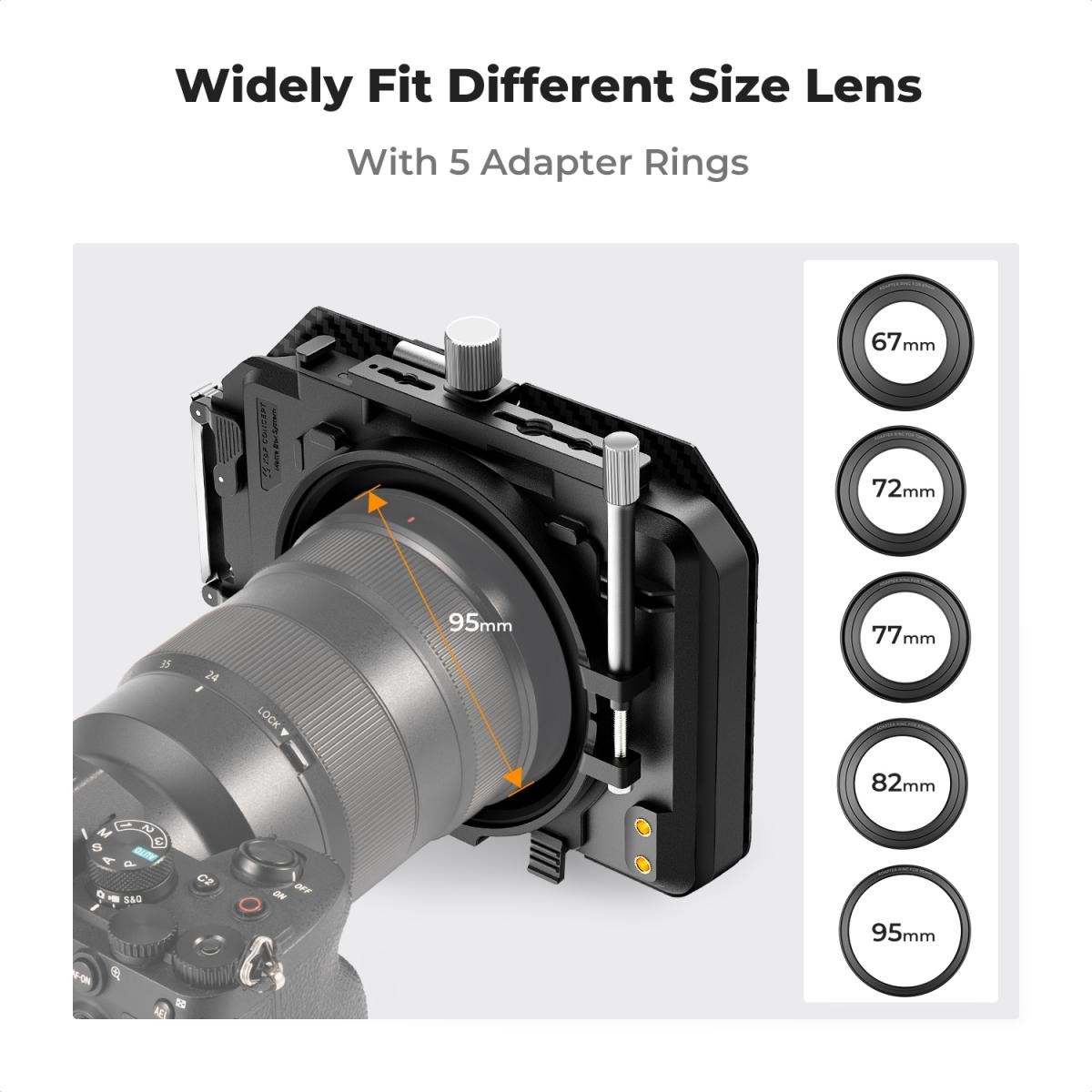 - * 【Átfogó kompatibilitás】 5 adaptergyűrűvel (67/72/77/82/95 mm) felszerelve, hogy a legtöbb DSLR és tükör nélküli objektívhez illeszkedjen. Több bővítőporttal (1/4", 3/8", hideg cipő) is rendelkezik, hogy további kiegészítőket lehessen felszerelni, és még gazdagabbá tegye a fényképezési élményt.