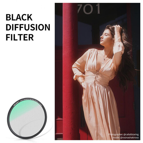 A 82 mm-es K&F Concept Nano-X Magnetic Black Mist Filter 1/8 mágneses adaptergyűrűvel és mágneses objektívsapkával érkezik egy kompakt tároló tokban. A 82 mm-es adaptergyűrű olyan objektívekre csavarozható, amelyek 82 mm-es elülső szűrőmenettel rendelkeznek. A fekete diffúziós szűrő ezután mágnesesen csatlakozik az adaptergyűrűhöz, és ugyanilyen könnyen eltávolítható, ha egy másik K&F mágneses szűrőt szeretne cserélni. A lencsevédő sapka mágnesesen rögzíthető a diffúziós szűrőhöz, amikor befejezte a fényképezést. Az objektívsapka menettel is rendelkezik az objektívekhez való közvetlen rögzítéshez.
