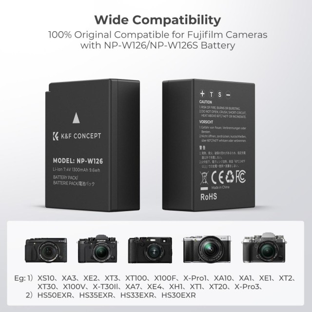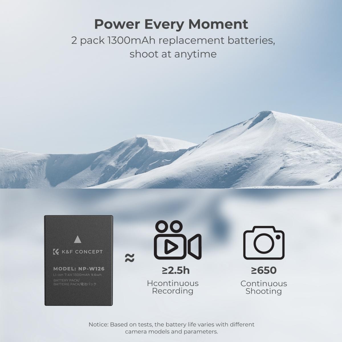 A hosszabb felvételi időt igénylő fotósok és tartalomkészítők számára tervezett K&F CONCEPT NP-W126 kettős akkumulátor és töltő készlet praktikus és hatékony energiaellátási megoldást kínál bizonyos Fujifilm fényképezőgépekhez. A készlet két 1300 mAh-s NP-W126 csereakkumulátort tartalmaz, amelyek elegendő tartalék energiát biztosítanak a hosszú, megszakítás nélküli felvételekhez.