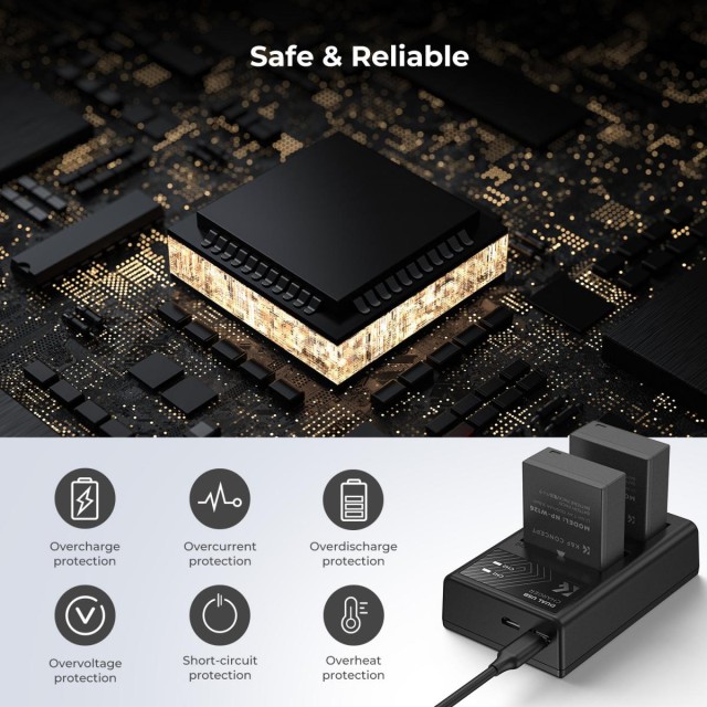 Az intelligens biztonsági védelmi rendszerrel ellátott töltő és akkumulátorok túlterhelés, túlmelegedés, túláram, túlfeszültség és rövidzárlat elleni védelemmel rendelkeznek, így biztosítva a biztonságos és megbízható működést bárhol is fényképezzen.