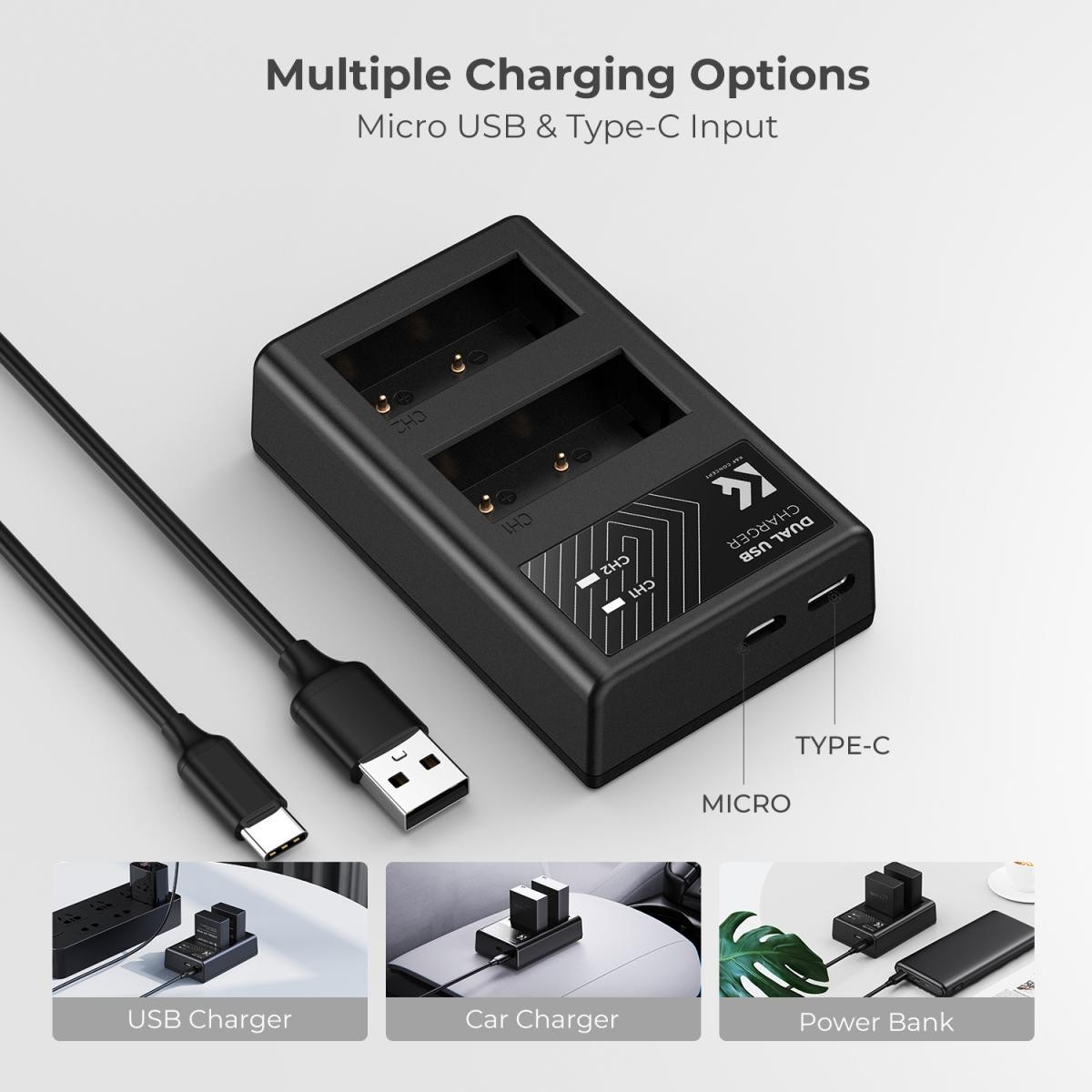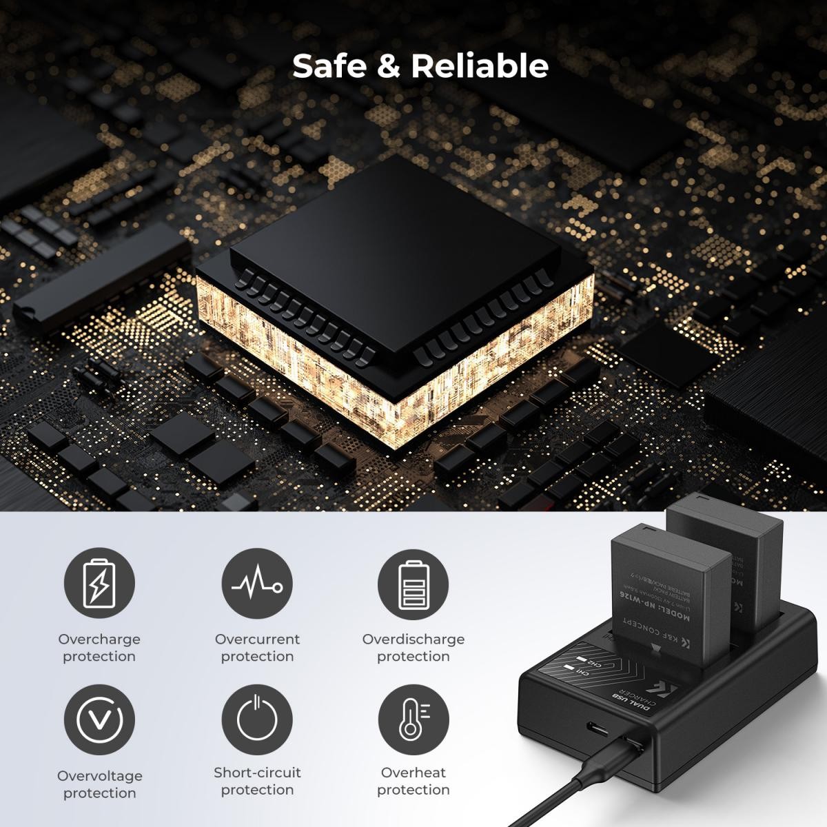 A teljesen dekódolt akkumulátorok biztosítják a szabványos kompatibilitást és a támogatott fényképezőgépekkel való zökkenőmentes kommunikációt, miközben az eredeti Fujifilm töltőket is támogatják. A mellékelt kétcsatornás töltő lehetővé teszi két akkumulátor egyidejű töltését, és mikro-USB és USB-C bemeneti portokkal rendelkezik a sokoldalú töltés érdekében. A töltőt power bank, USB fali adapter, laptop vagy autós töltő segítségével lehet tölteni a maximális kényelem érdekében.