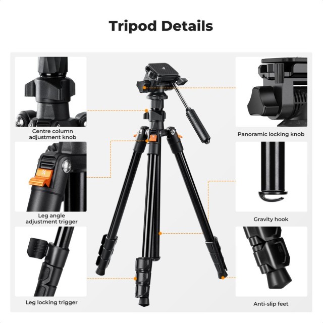 A háromlábú állvány ötvözi a funkcionalitást és a hordozhatóságot, 4 részes lábakkal rendelkezik, maximális magassága 196 cm. A fej leszerelése után az állvány összecsukható, összecsukott mérete mindössze 43 cm, így könnyen tárolható hátizsákban vagy fényképezőgép-táskában.