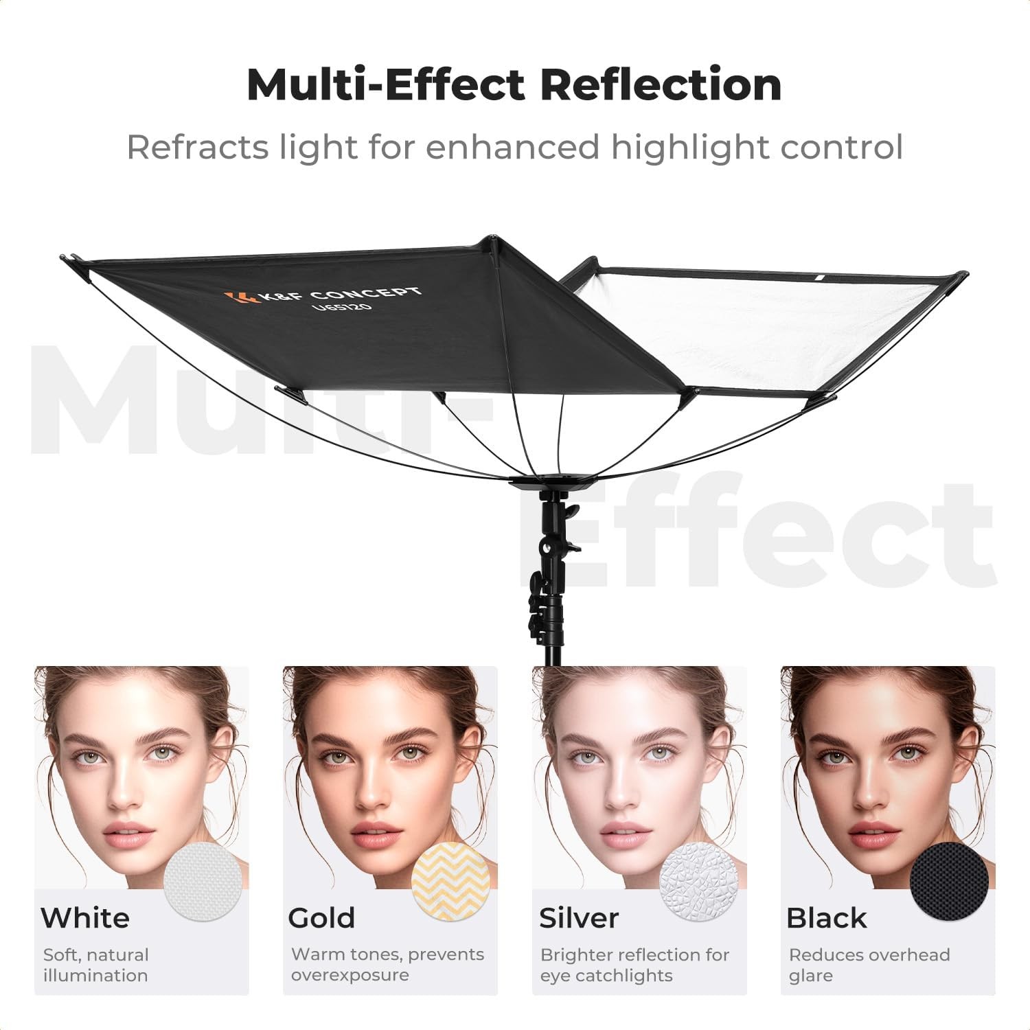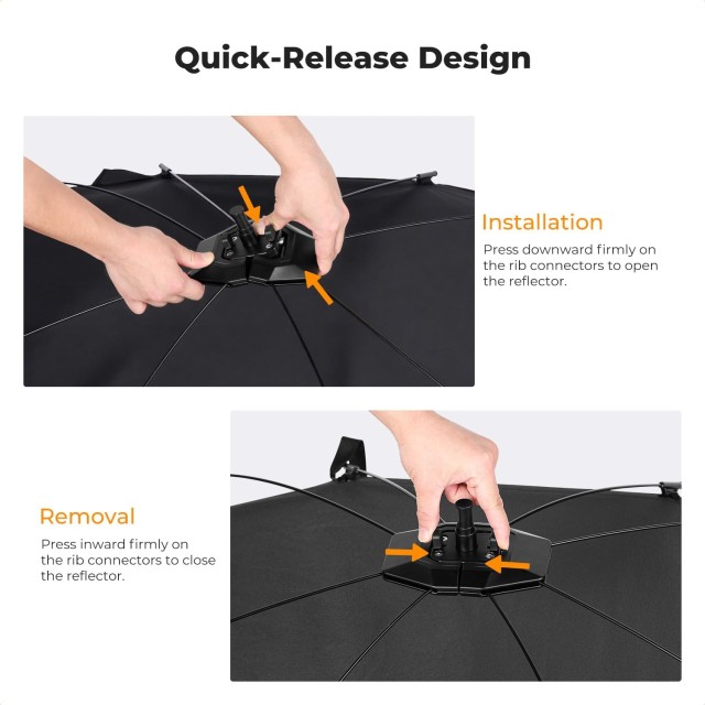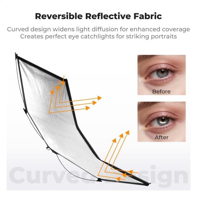 A K&F CONCEPT Quick-Release Curved Reflector egy könnyű, hordozható, 123×65 cm-es reflektor, amelyet puha, előnyös fény megteremtésére terveztek. 4 az 1-ben mágneses burkolataival, 180°-ban állítható talpával és gyorskioldó rendszerével tökéletes kültéri portrék, helyszíni fotózások és professzionális minőségű catchlightok készítéséhez.