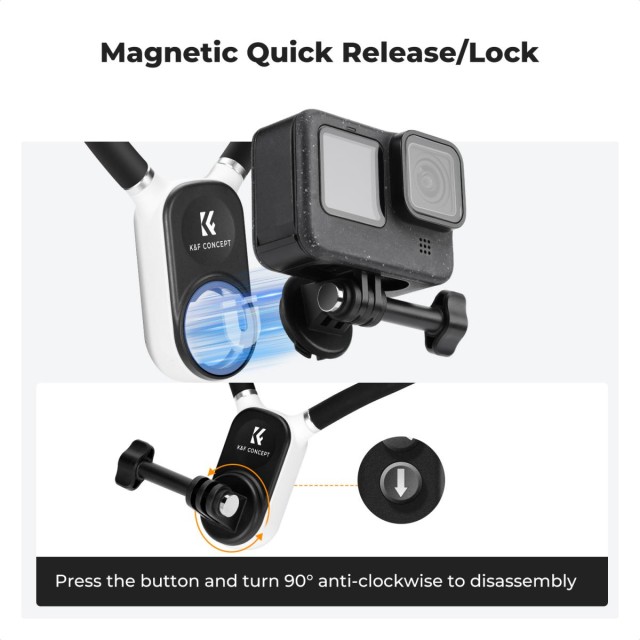- * 【180°-ban állítható szög és egyszerű használat】 A dönthető tartó 180°-ban állítható, míg a 360°-ban forgatható J-rúd a függőleges/vízszintes felvételek szögét állítja be. Tökéletes vlogokhoz, túrázáshoz vagy utazás közbeni felvételekhez, dinamikus és kreatív perspektívákkal. A mágneses kameratartó segítségével a heveder gyorsan kioldható vagy rögzíthető. A heveder 90°-os óramutató járásával megegyező irányba elforgatva biztonságosan rögzíthető. A rögzítés feloldásához nyomja meg a gyorskioldó gombot (lefelé mutató nyíl), majd forgassa 90°-kal az óramutató járásával megegyező irányba