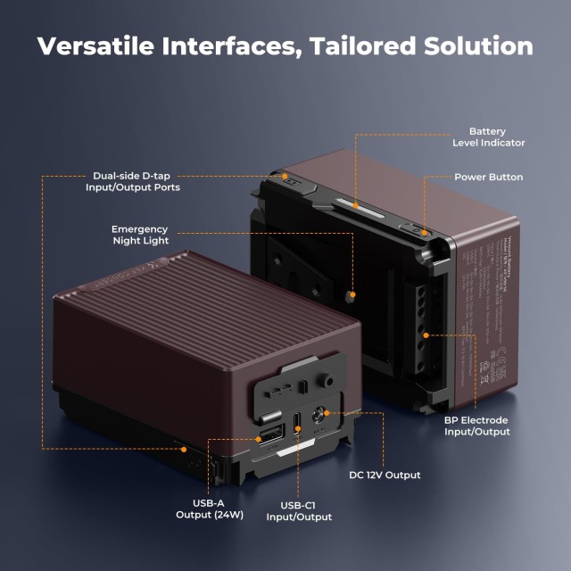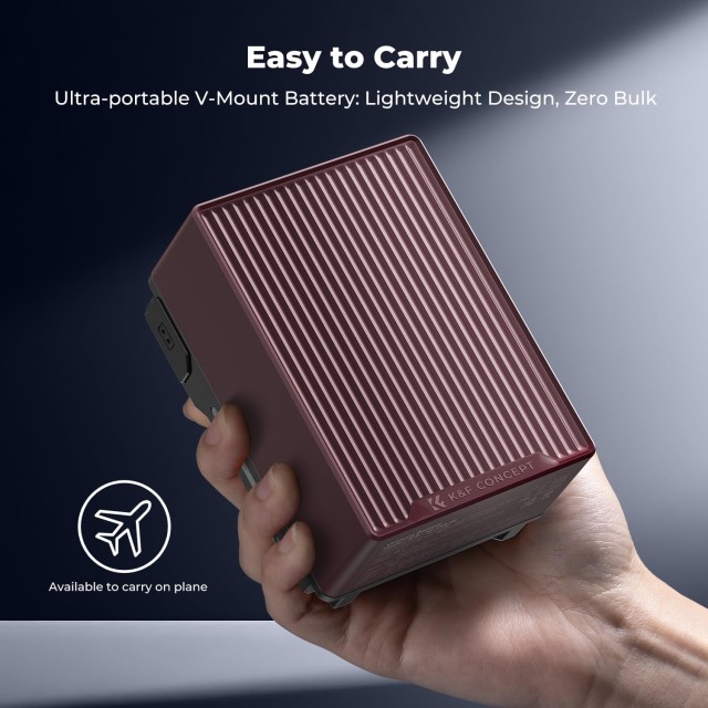 Hordozható kialakítás és repülőgépen is használható: a V-mount akkumulátor mérete 104*74*50, súlya 525 g. A burkolat erős és ütésálló, tűzálló PC anyagból készült, amely karcálló és biztonságos használatra. Repülőgépen is használható, a fedélzeten is szállítható