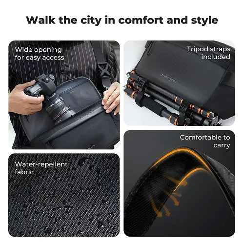 Ergonómikus válltáska kialakításának köszönhetően a táskát előre lehet fordítani a gyors hozzáférés érdekében, anélkül, hogy le kellene venni, a tolvajbiztos hátsó zseb, a külön tabletrekesz és a lélegző, párnázott pánt pedig ideálissá teszi egész napos használatra. Ez a sokoldalú, 10 literes táska tökéletes társ fotósok és videósok számára, akik könnyű, gyorsan hozzáférhető hordozási megoldást keresnek, amely védi felszerelésüket és a legfontosabb tárgyakat kéznél tartja.